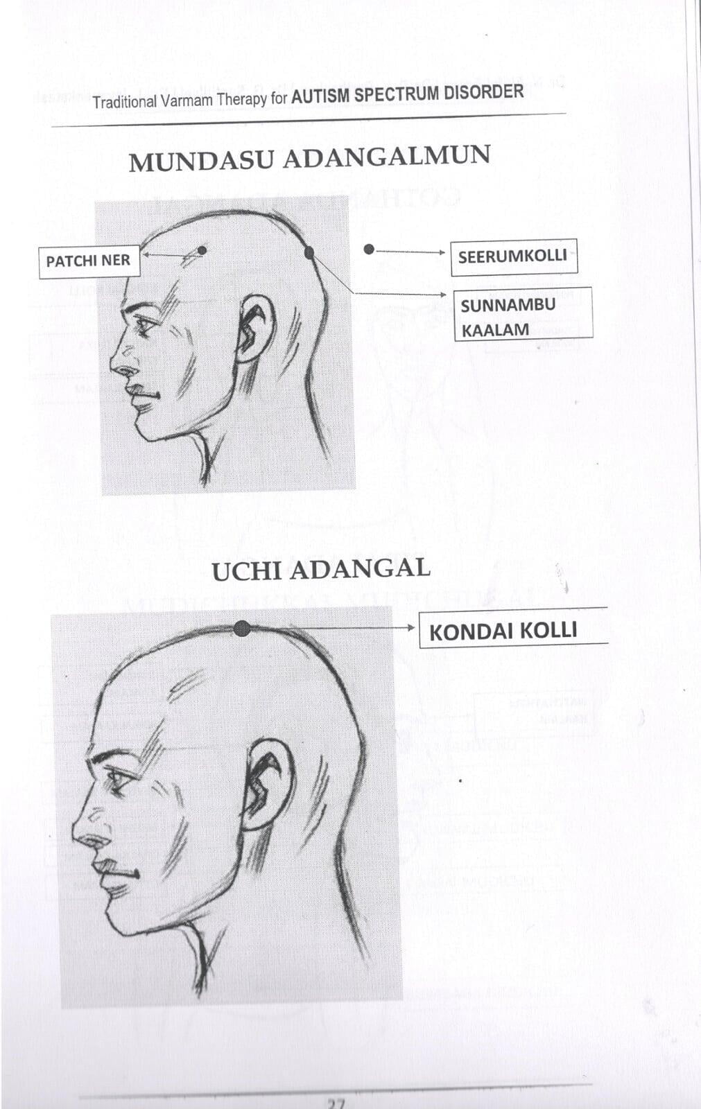 The choice of Varma points to be administered to the child is up to the sole discretion of the medical practitioner who is well-trained in Varmam. Varma can be used in isolation. The prerequisite for applying the Varma therapy to children in the spectrum needs to be followed strictly. It is vital to connect to the child before applying Varma stimulation since most children with ASD have Tactile defense (Tactile hypersensitivity) and any violation of this will lead to non-cooperation from the child and non-beneficial results. Hence we ensure connecting to the child slowly and methodically and also with reinforcements, if necessary. We believe in gentle enhancement and also along with other therapeutic practices for complimentary benefits. The following Varma points (not just limited to this list) are very beneficial in children with Autism spectrum disorder.